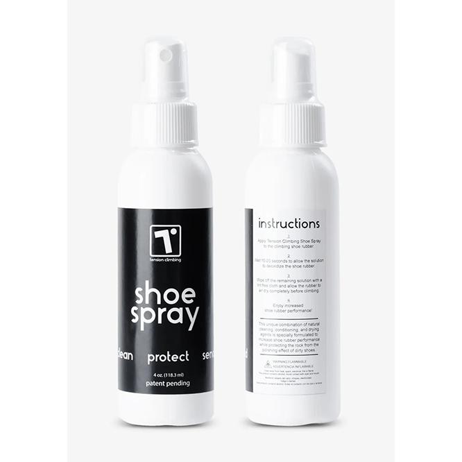 - Appliquez 2 à 3 pulvérisations de spray pour chaussures d'escalade Tension sur le caoutchouc des chaussures d'escalade.