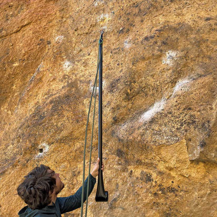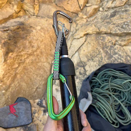 A handy stick clip for hanging or retrieving quickdraws, or clipping a rope into pre-hung draws to protect a climber from a potential ground fall. The simple design can be used with any non-locking climbing carabiner.