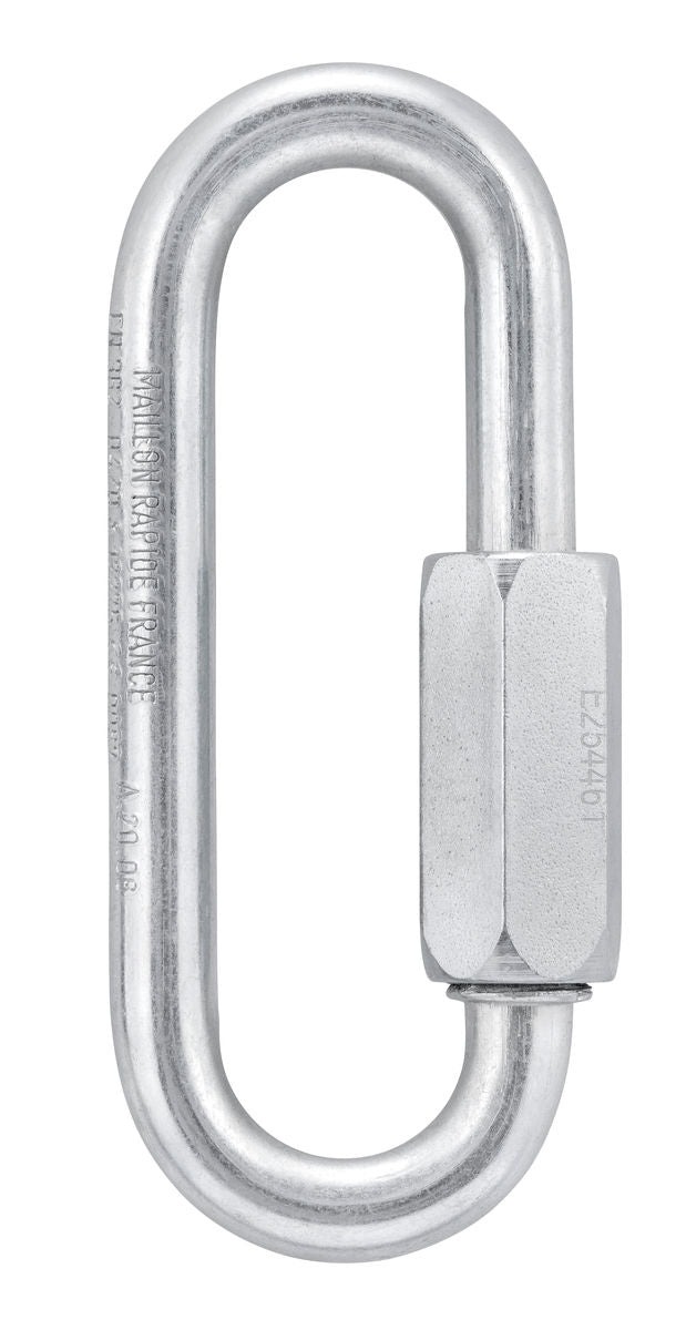 GO is an 8 mm wide-opening quick link, which may be used for permanent connection of sling webbing to an anchor. It may also be left at an anchor for rappel installation. The galvanized steel frame ensures excellent resistance.