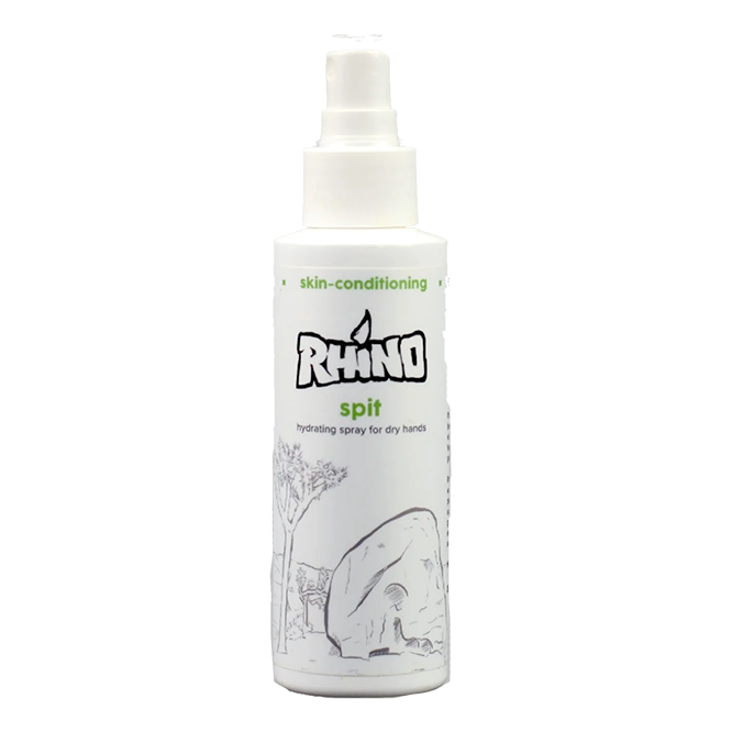 Rhino Spit is a skin hydration tool designed for those with overly dry hands that tend to glass or dry fire off holds.Rhino Spit is a non-greasy, aloe-based spray that is quick to absorb.